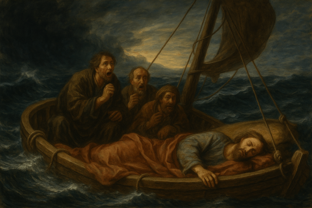 KI generiert: Jesus schläft im Sturm, während die Jünger angst haben.
