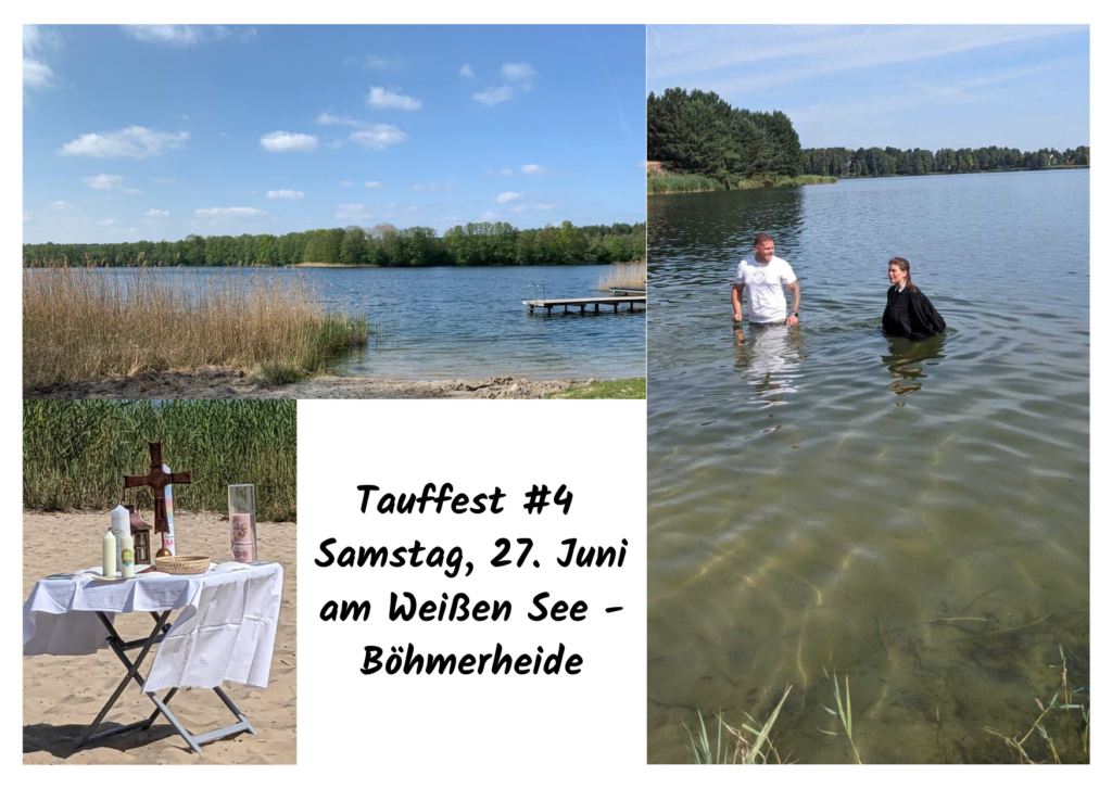 Nach der Begeisterung in den vergangenen Jahren, haben wir uns als Region überlegt, ein solches Fest regelmäßig zu veranstalten. In diesem Jahr wiederholen wir ein Tauffest in Beteiligung der ev. Kirchengemeinden entlang der Heidekrautbahn am Weiße See – Böhmer Heide am 27. Juni ab 11:00 Uhr.